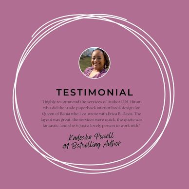 U.M. Hiram is an Award-Winning Author, and Literary Consultant. She is also a 21-year retired military veteran and mom. Her love for writing began at an early age, evolving into independent publishing. Reading, traveling, watching sports and spending time with her family is what she enjoys doing the most when not putting pen to paper.